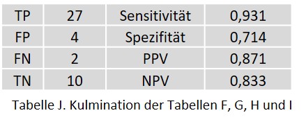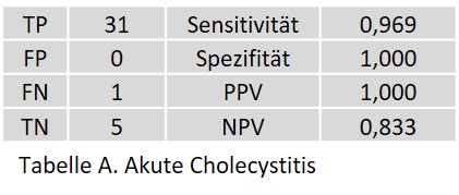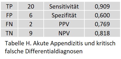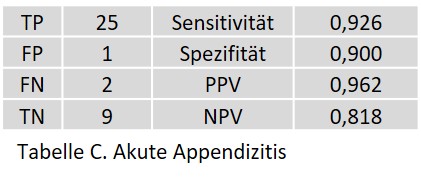 Bei der akuten Appendizitis wurde ein FP in einem radiologisch und klinisch unauffälligen Patienten festgestellt. Die beiden FN wurden bei einem Patienten mit eindeutig positiven CT-Befunden und klinischen Symptome beobachtet.