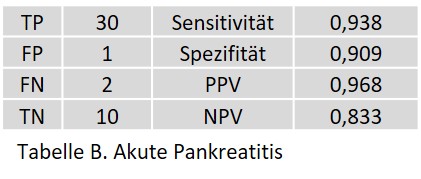 Bei der akuten Pankreatitis wurde ein FP ohne jegliche positive CT-Zeichen beobachtet. Zwei FN traten bei Patienten mit den CT-Zeichen einer beginnenden akuten Pankreatitis auf.