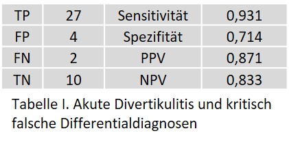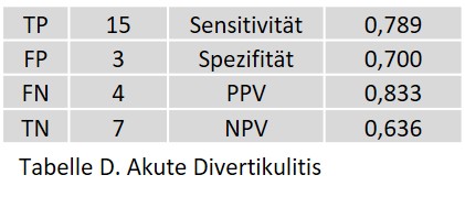 Bei der akuten Divertikulitis traten zwei FP aufgrund einer Fehlinterpretation einer reaktiven Mesenteritis bei akuter Cholezystitis auf. Ein FN trat bei einem Patienten mit schwerer Pancolitis (entzündliche Darmerkrankung) auf, die sich klinisch, pathologisch, histologisch und radiologisch deutlich von einer Divertikulitis unterschied. Alle vier FN betrafen das linksseitige Colon.