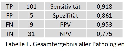Tabelle E zeigt das Gesamtergebnis des AI-Assistenten für alle akuten Pathologien.