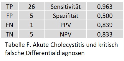 Bei der akuten Cholezystitis wurde ein FP bei einem chirurgisch und histologisch bestätigten, ausgeprägten Hydrops und einer Verdickung der Gallenblasenwand beobachtet.